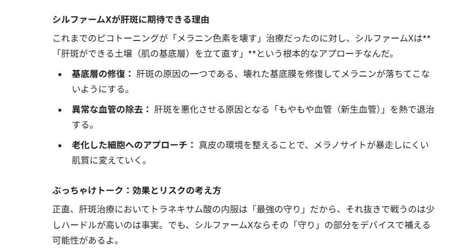 ピコトーニングとエレクトロポレーション(トラネキサム酸)を10回受けて、肝斑には効果を感じられなかったがシルファームXをやるべきかを尋ねた回答です。