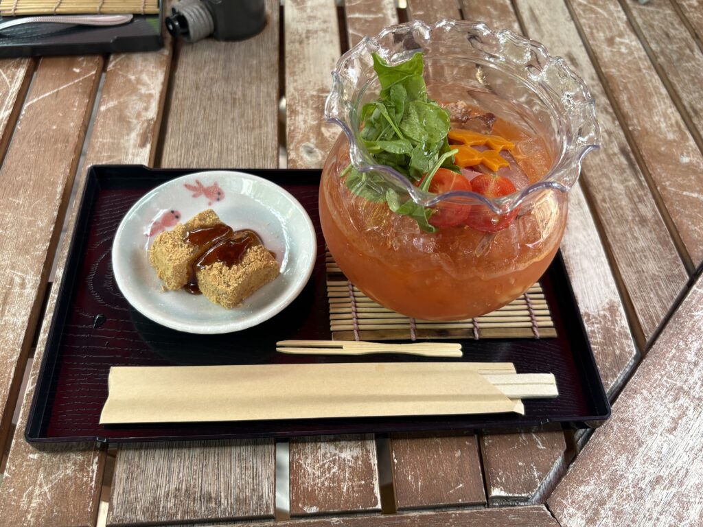 こちらで頂いたのは「金魚鉢ソーダ」と「冷やしトマトらーめん」です。